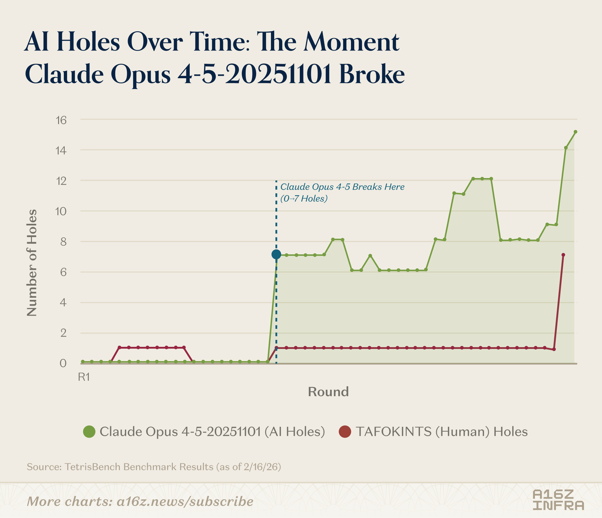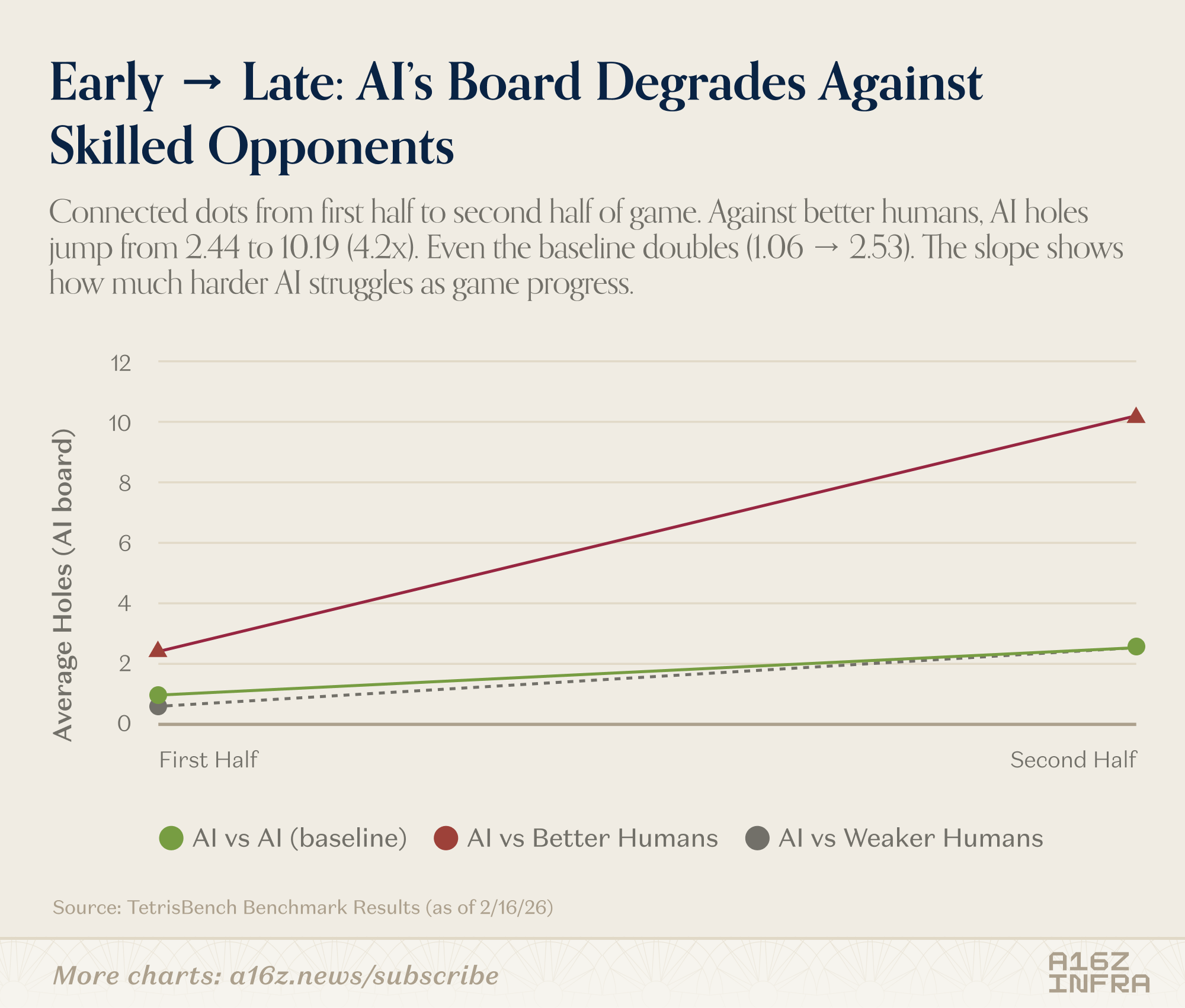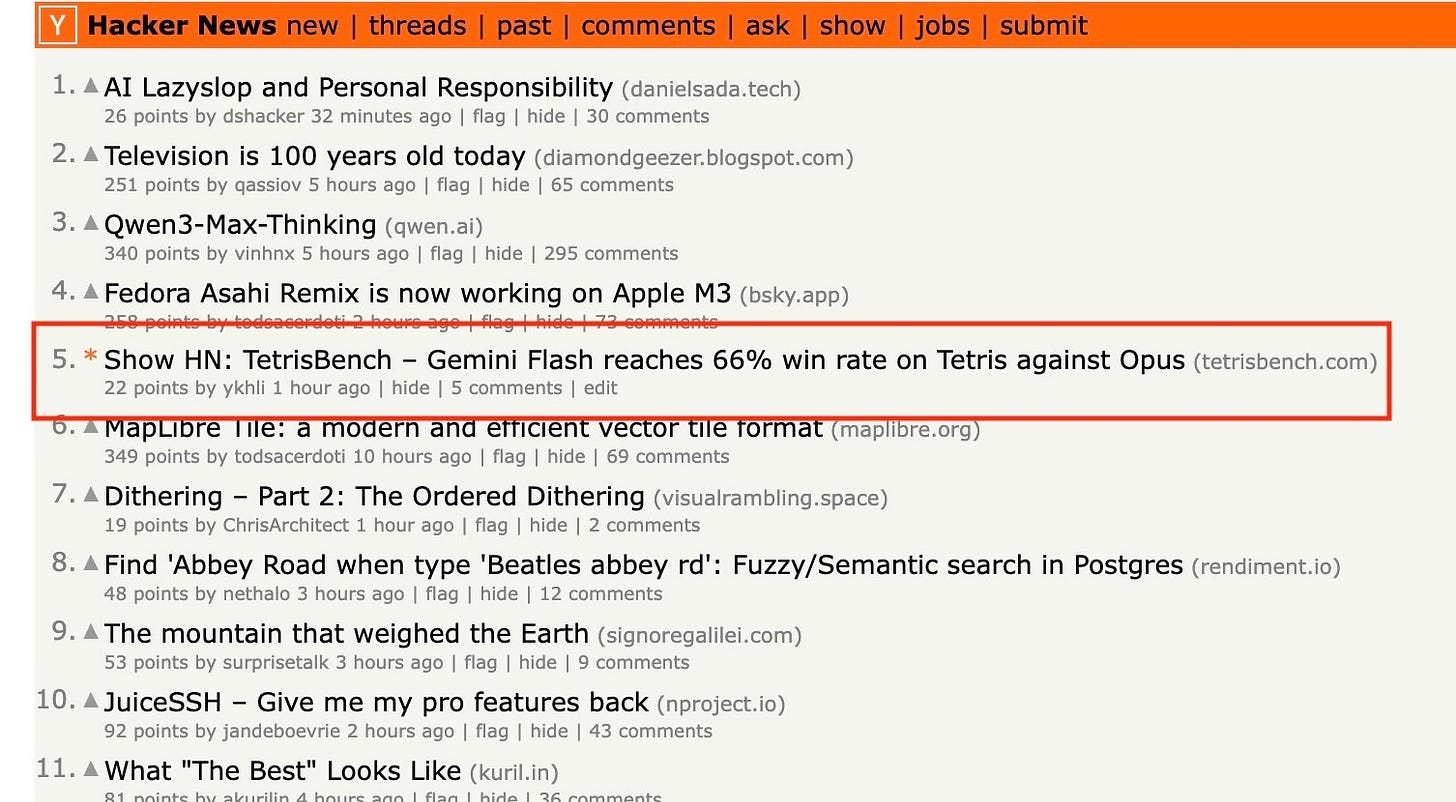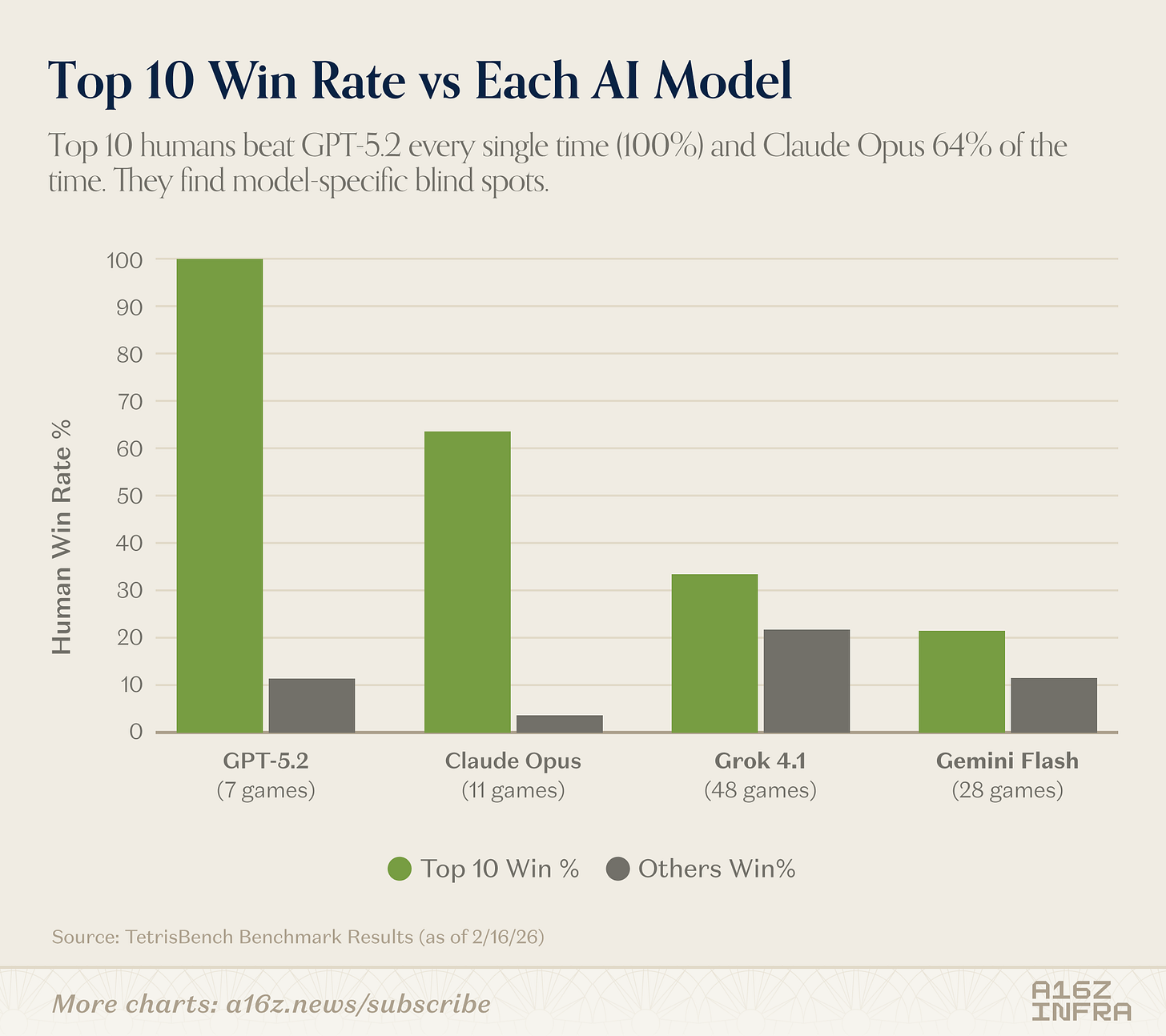 Games are some of the best forms of benchmarks for LLMs: they create a sandboxed world where a model has to actually plan and adapt over time (and of course, they’re quite fun to watch as well). A few weeks ago, Yoko Li, one of our investing partners on the infra team, posted a short writeup of an experiment she ran building a benchmark for LLMs playing Tetris. Today, she’s following that up with a longer post about how she built TetrisBench. What makes her reflection so interesting is how it shows each model kind of has its own personality when it plays: some constantly tweak their strategy mid-game, others lock in on one approach and ride it out to the end. And while LLMs can now beat humans at Tetris in most scenarios, there are some revealing exceptions, as Yoko found.