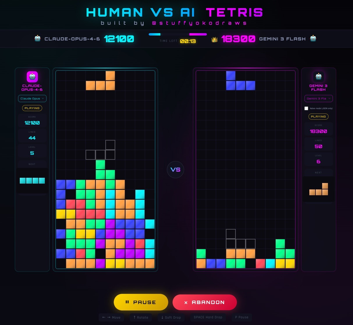 One such example is a game where TAFOKINTS (a user who used to compete in Tetris competitively) played against Claude Opus 4.5. TAFOKINTS eventually scored 22,300, beating Opus’ 15,700. What’s interesting is Opus played perfectly for 21 rounds, then TAFOKINTS caught up quickly: