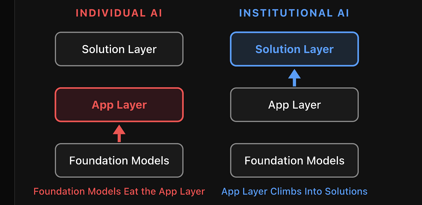 Institutional intelligence is the solution layer. And the solution layer, where the outcomes live, will accumulate lasting value and capture the biggest upside.