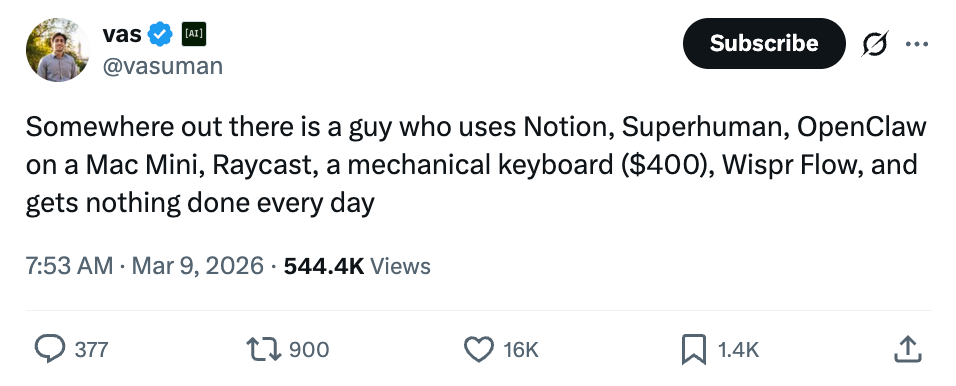 The wide majority of AI products evoke the feeling of being productive, but they haven’t moved the needle on driving value. The majority of publicized AI use is individuals self-indulgently “productivity-maxxing” on Twitter or in company Slack channels, with zero real impact.