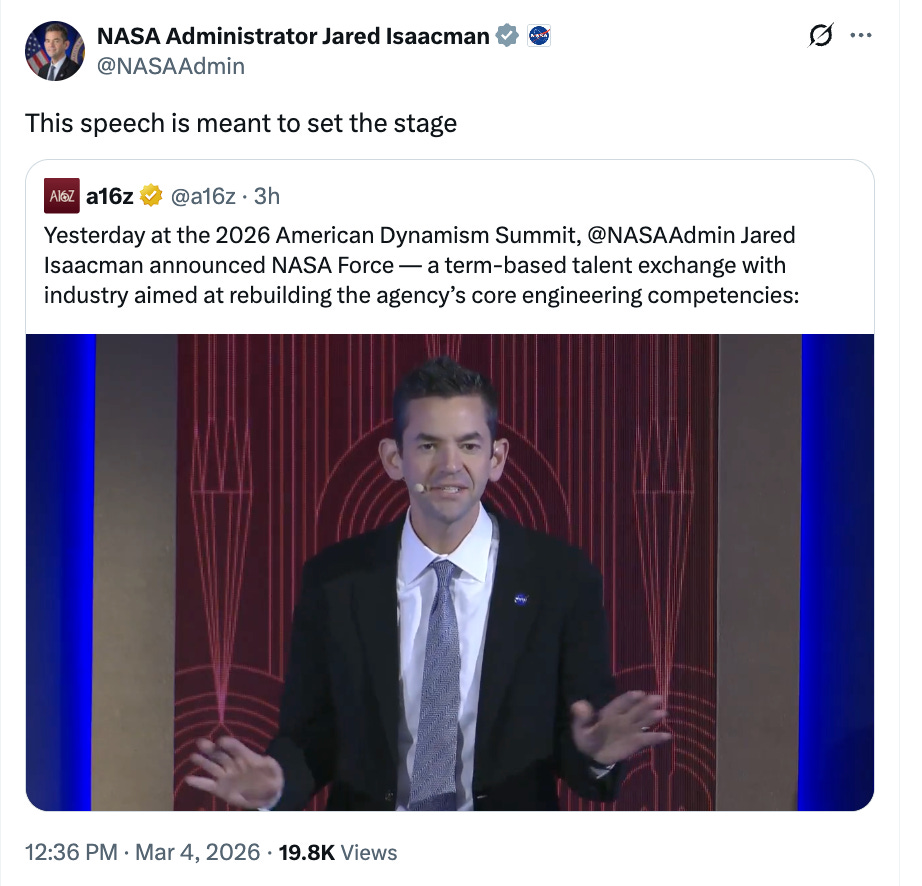At Tuesday’s American Dynamism 2026 Summit, NASA Administrator Jared Isaacman announced NASA Force: a new initiative to rebuild NASA’s core personnel capabilities. Here is Jared’s speech: