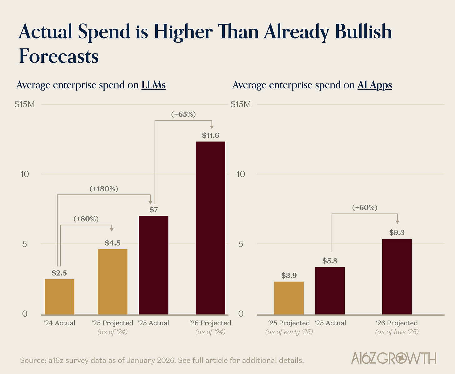 Over the last 2 years, average enterprise AI spend on LLMs has risen from ~$4.5M to ~$7M, and enterprises expect it to grow another ~65% this year to ~$11.6M.