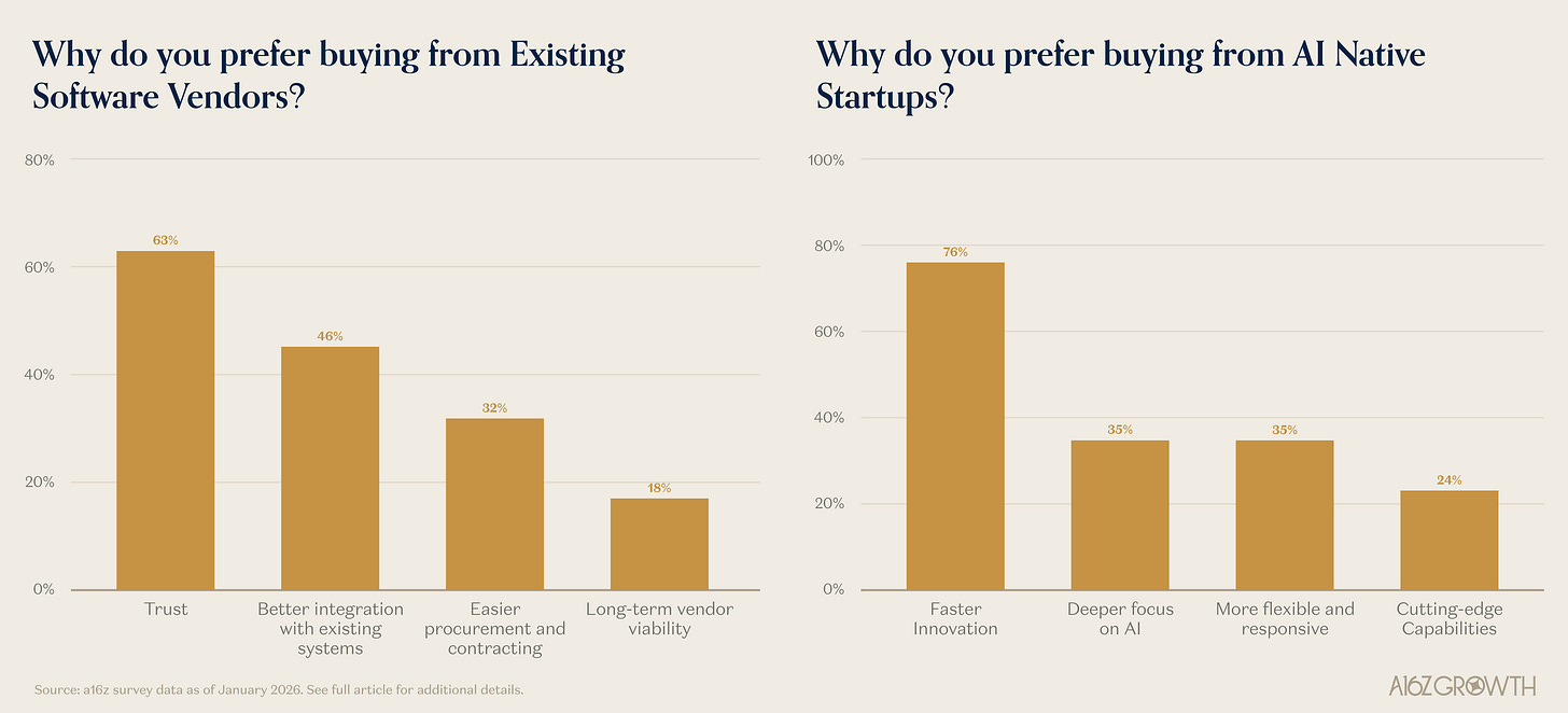 All this said, the prize is still up for grabs. While these are difficult to overcome (in addition to the far reaching distribution of an incumbent such as Microsoft), we believe there is an enormous opportunity for startups to chip away at these advantages. Platform shifts create openings and enterprises consistently say they value faster innovation, deeper AI focus, and greater flexibility paired with cutting edge capabilities that AI native startups bring.