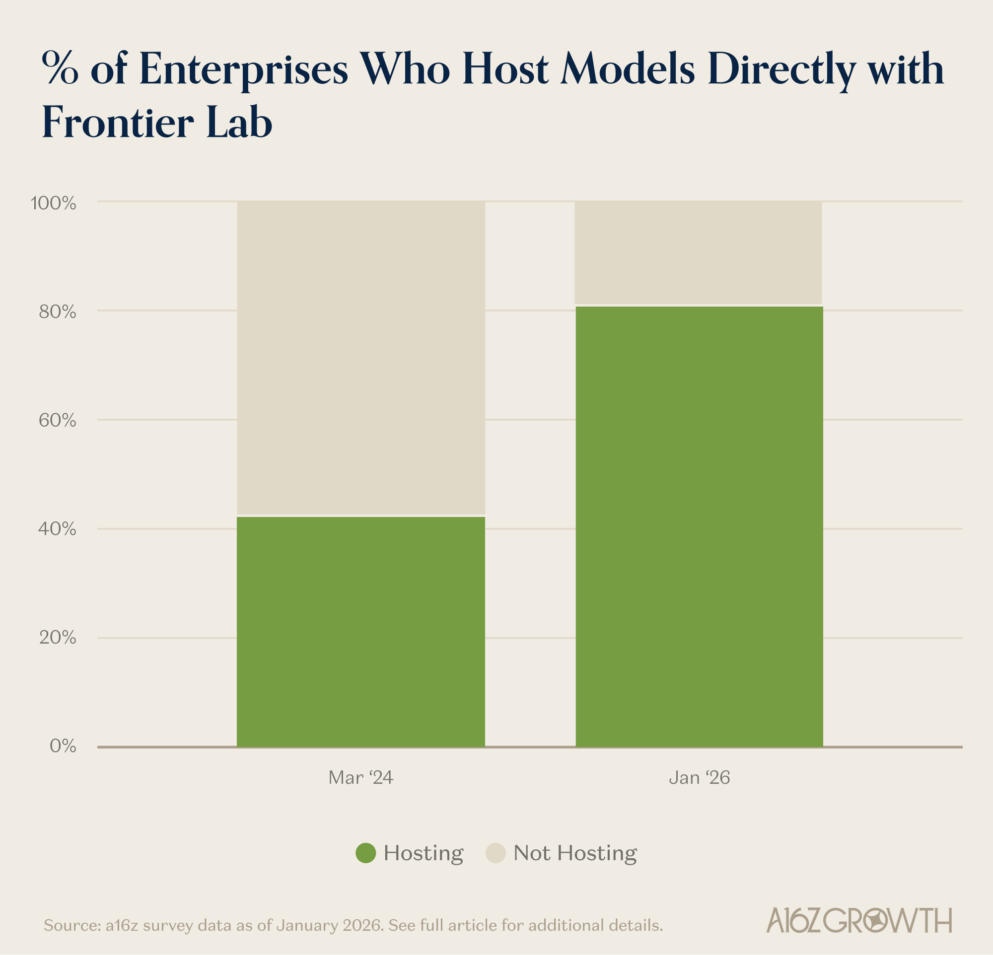 As another signal of trust, ~80% of enterprises are comfortable hosting their models directly with enterprises vs. CSPs and other sources, up from ~40% in March 2024.