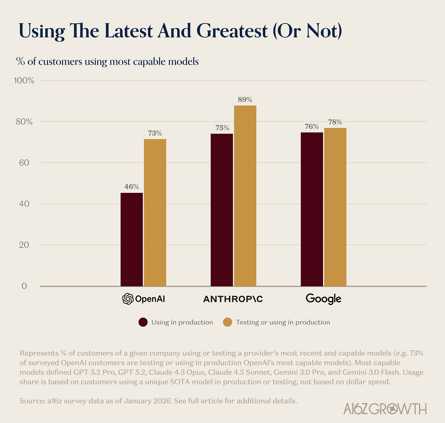 R&D is customer acquisition. Anthropic’s gains are driven by its most advanced models. 75% of Anthropic customers had Sonnet 4.5 or Opus 4.5 in production, far outpacing adoption of its older, cheaper models. OpenAI, by contrast, still sees significant usage of earlier model families–often because they were adopted early and continue to “work well enough.” Switching costs are rising, reinforcing the advantage of early enterprise footholds. 46% of OpenAI’s customers had GPT 5.2 or 5.2 Pro in production.