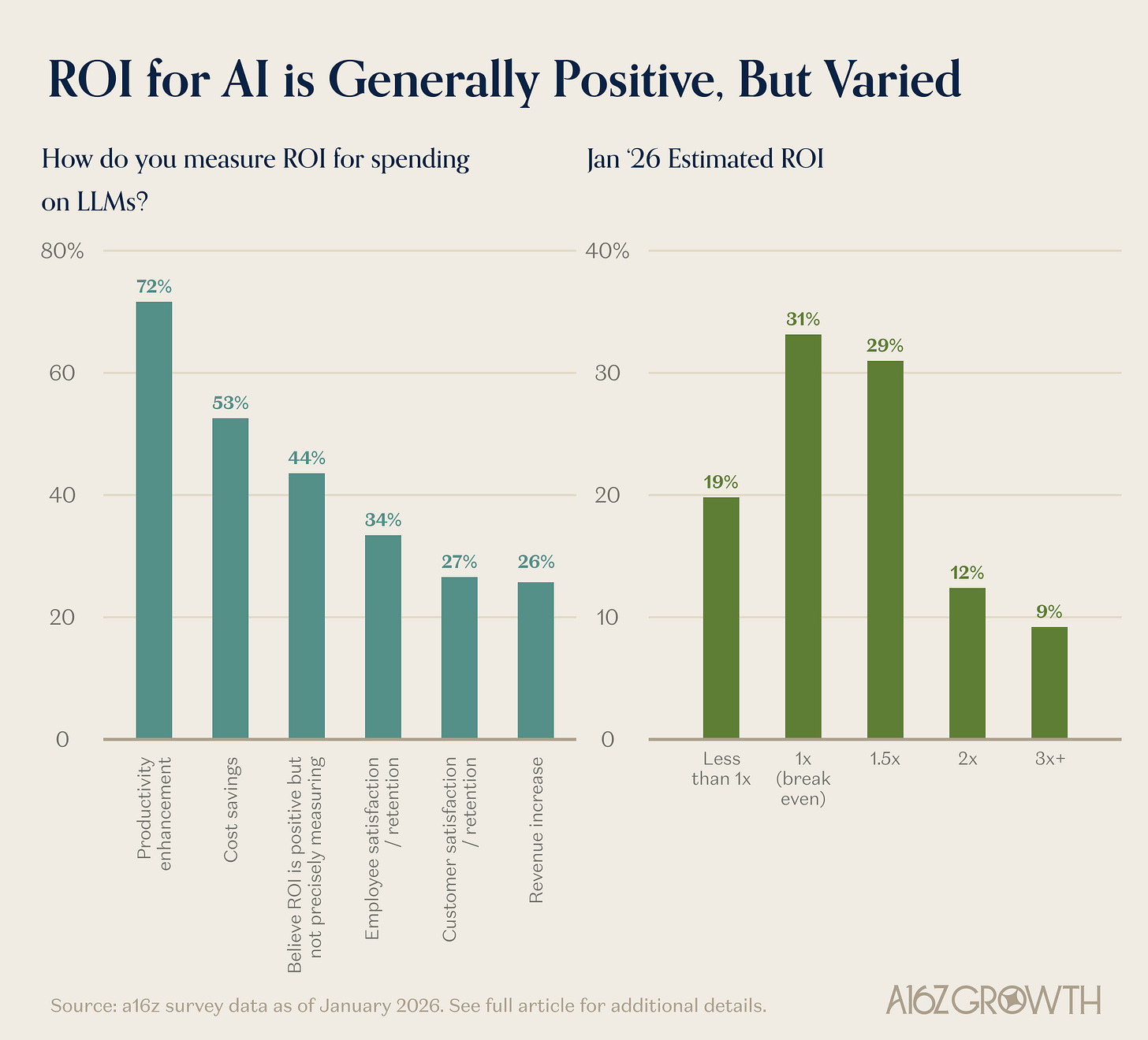 ROI reported by enterprises on LLMs (and AI applications) is less dramatic than one might expect based on the X AI discourse. This gap likely reflects two things: