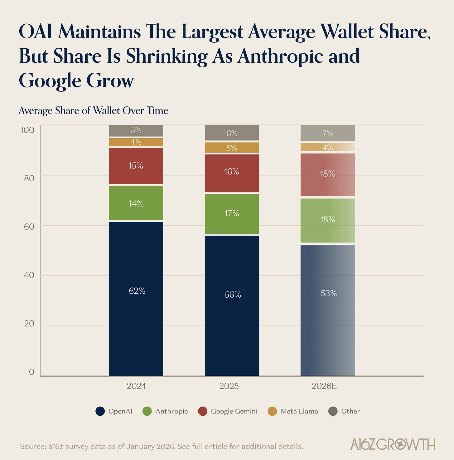 Wallet share tells a similar story. OAI still commands a majority at ~56%, but Anthropic and Gemini are steadily gaining at OpenAI’s expense. The survey also suggests that respondents expect that shift to continue into 2026. Despite share shifts, all three model providers saw strong absolute spend growth.