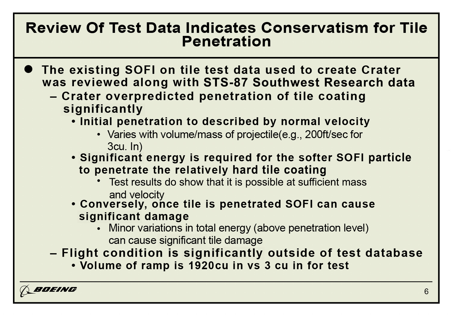 This is a good illustration of learned helplessness. Whoever assembled this slide knew exactly what the stakes were and what the data (didn’t) show; but reached a slide title all the same: “Review of Test Data Indicates Conservatism for Tile Penetration”. The mandate was the message.