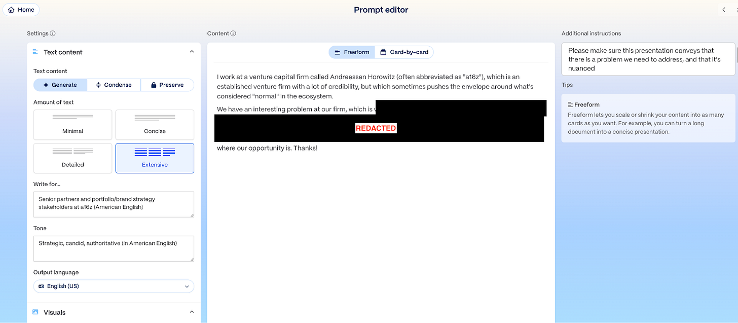 Prior to learning more about Gamma as a part of their fundraising process, I started playing around with the product for the first time - I’d never actually used it before. And man, let me tell you, that initial prompt box (which expands into a more powerful dashboard once you click through) is a powerful format for getting you to actually think through the situation. I tried putting it to work on a problem we’re thinking through on the New Media team right now, and I was absolutely blown away by how effortlessly the product guided me into actually thinking critically about the presentation, and how effortlessly it set our conversation up for success. It made us think better.