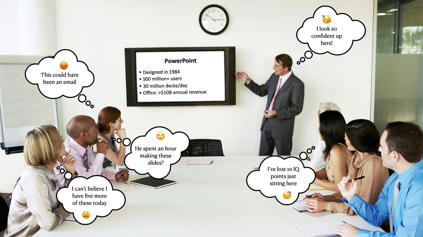 PowerPoint’s real job-to-be-done has always been, “Help the presenter survive the presentation.” Our tools should aim higher than this!