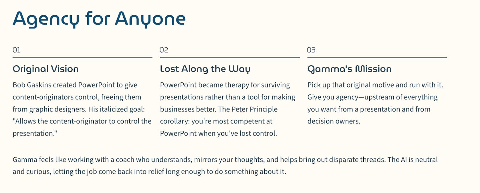In a world where agency is everything, you don’t want PowerPoint to be your therapist. You want Gamma to be your coach.