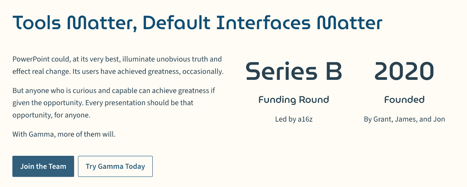 I’m not sure I’ve ever seen a company’s Seed Round pitch deck include a quote from its subject medium’s greatest hater. But, there you have it. Succinctly expressed, indisputably true: “PowerPoint makes us dumb.” And in the five years since founding Gamma, Grant, James and Jon have done something I didn’t think possible: they’ve actually made progress on the root of the problem. They built “PowerPoint but it makes you smart.” And higher-agency, too!