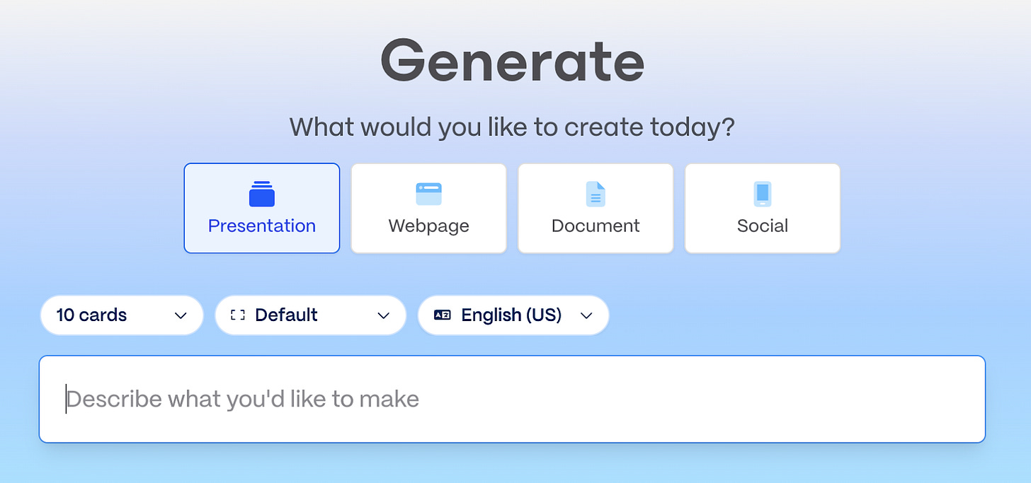 Opening up Gamma, on the other hand, is a different sort of energy. Your first encounter with the product, at the start of your hero’s journey, isn’t a blank slide that must be built to survive (and then another, and another.) Instead, it’s a prompt box: “Describe what you’d like to make.”