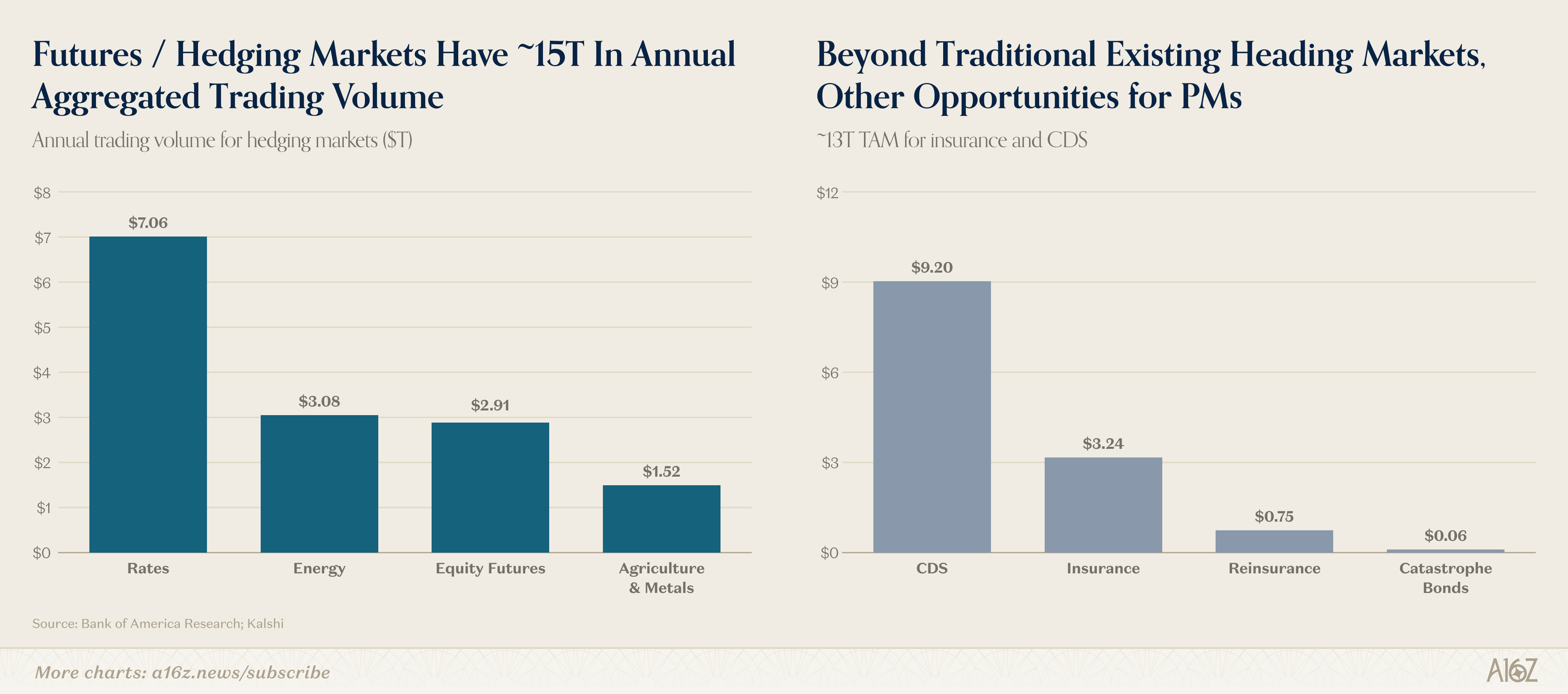 Garrett Herren from Vote Hub described the end state: “It’s not going to be a question of whether we should use prediction markets, but how. And as soon as you start asking that question, you know it’s become indispensable.” Indeed, while prediction markets are currently relatively small, hedging markets are massive: