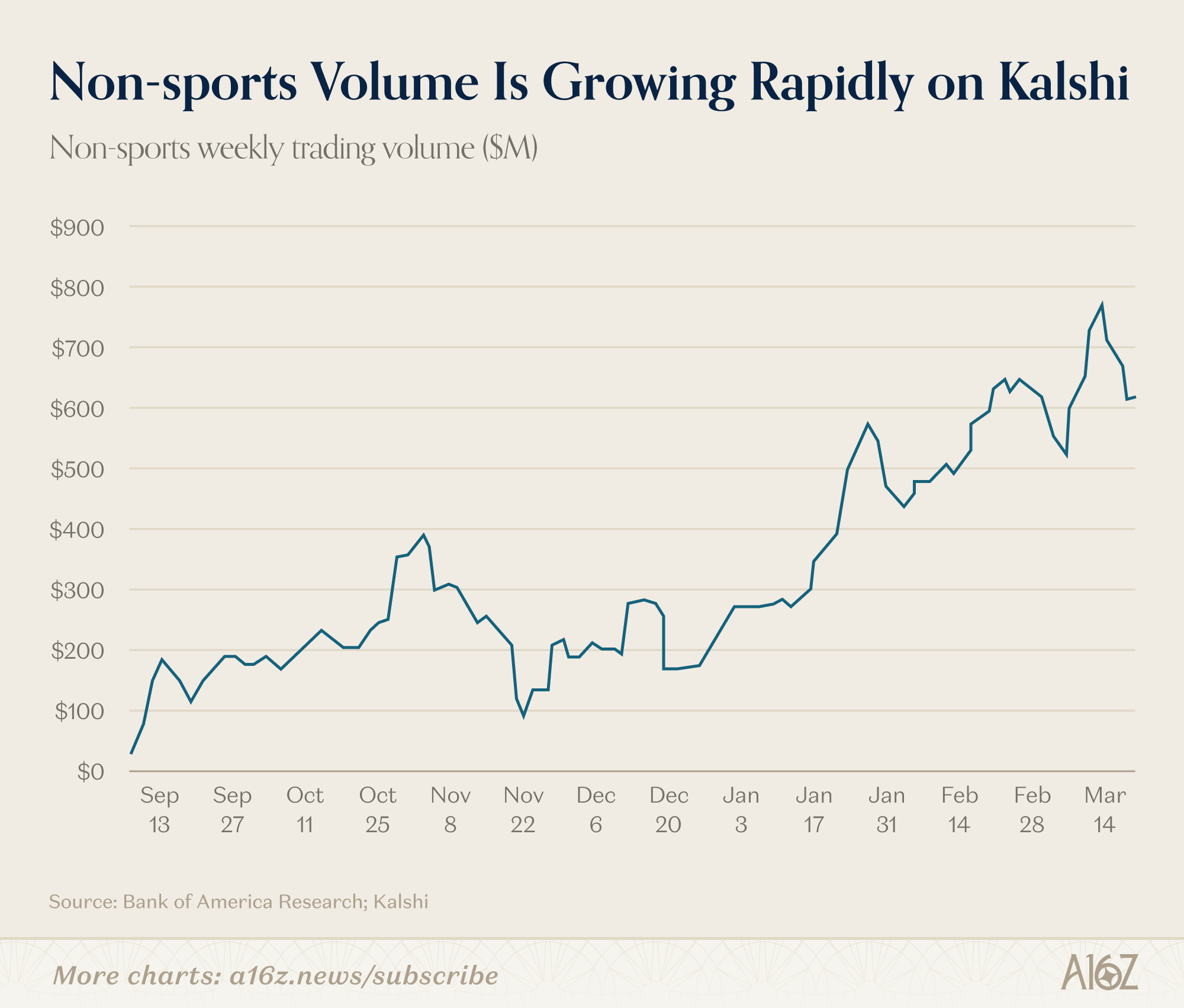 The more revealing stat: sports as a share of total volume was actually at an all-time low even as its absolute volume hit an all-time high. Every other category is growing faster.