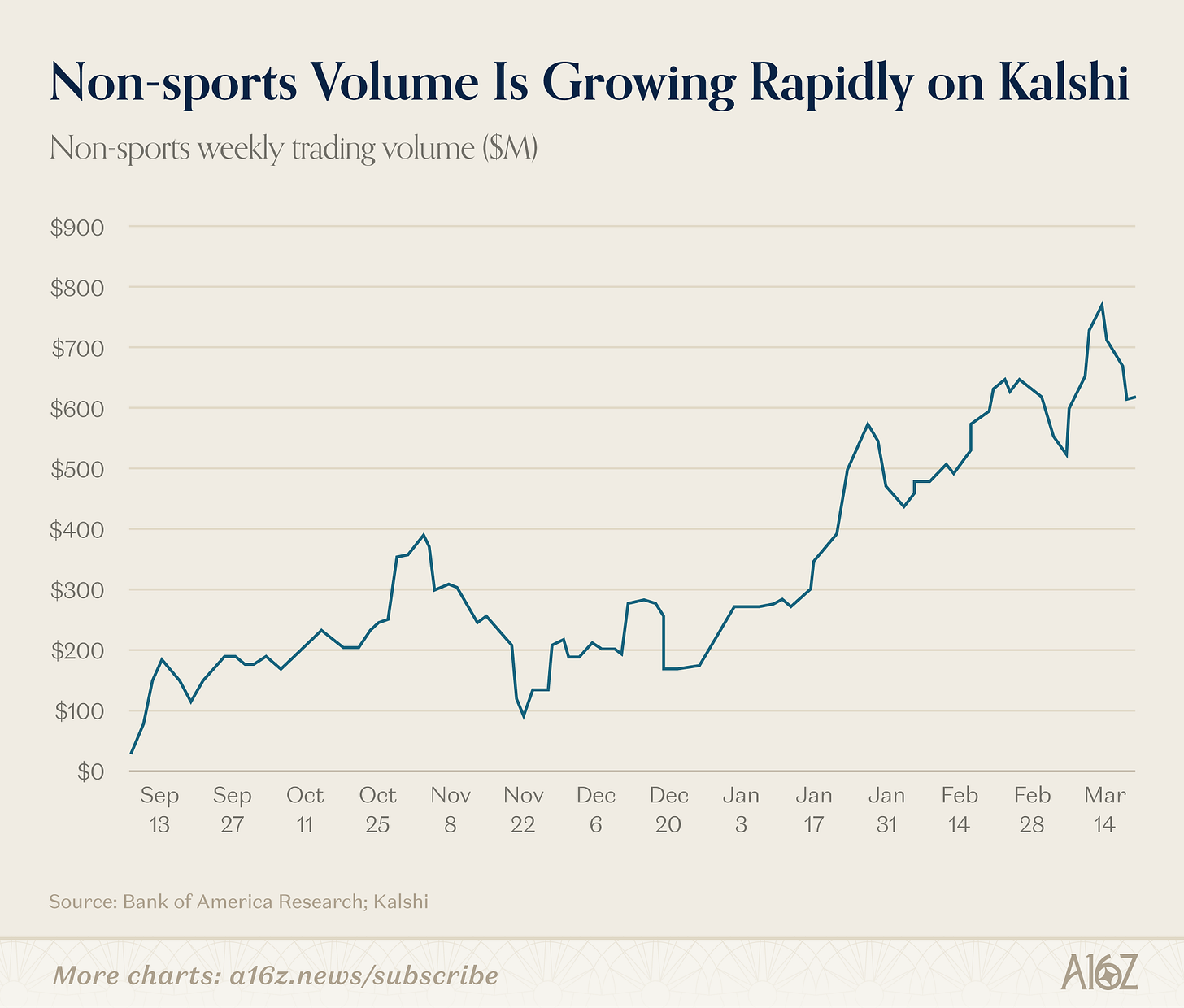 But the company is seeing significant growth in its longer-tail markets that make up the remaining 20%+ of Kalshi’s volume, and that are going to be important to institutional hedging and information markets.