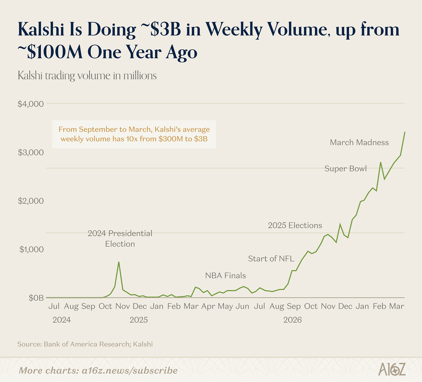 At the time of the research conference, sports trading had just hit nearly $3 billion in weekly volume, roughly 80% of Kalshi’s total, largely driven by March Madness. Tarek and Luana framed this dominance as a phase.