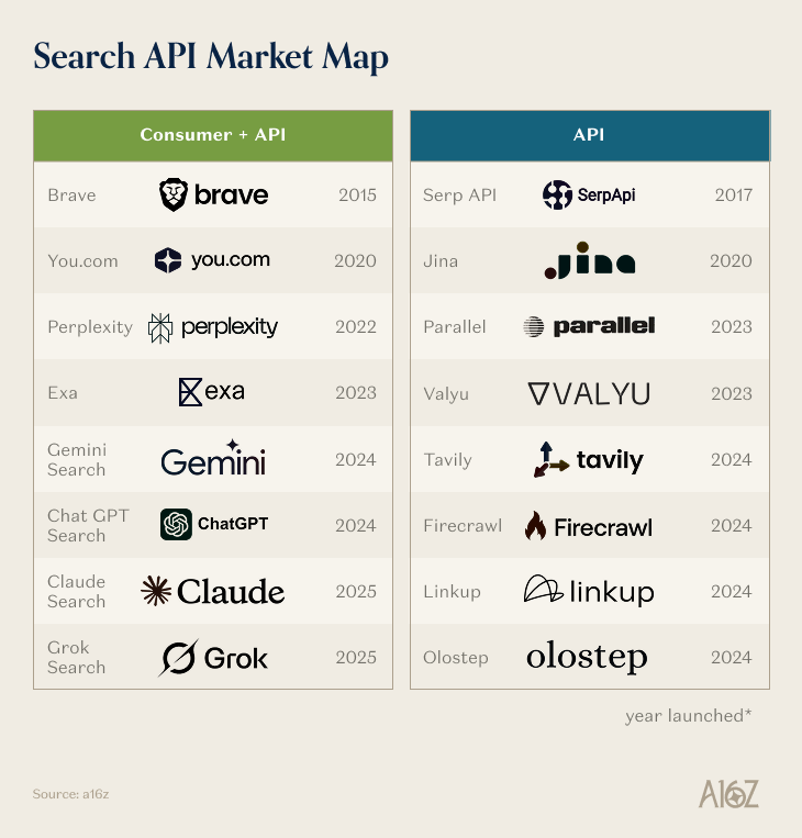 Most consumer-facing companies with a web search use case (Deep Research, CRM, technical documentation…) are outsourcing to a specialist rather than building their own search stack. That said, a few of the larger labs and startups are building both a consumer-facing product and a developer-facing API service.
