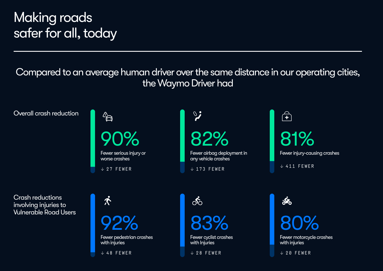 In June 2025, Waymo published its safety impact comparing its rider-only program to human drivers. The headline stats should be surfaced on billboards: 90% fewer crashes that cause serious injury or worse, and 81% fewer crashes that cause any injury at all.