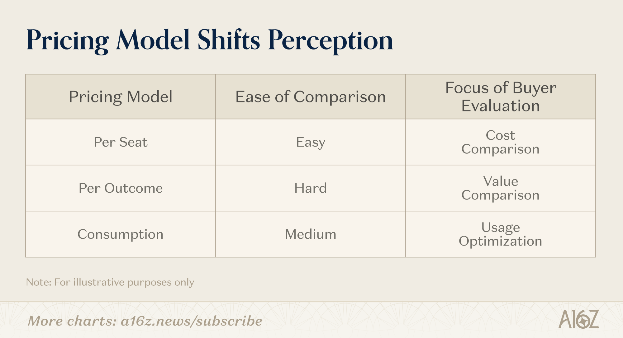 The most underused lever in AI apps pricing isn’t the number — it’s the unit. How you charge is as much a competitive lever as what you charge. AI app companies are experimenting with per-seat, per-outcome, per-workflow, and consumption-based models. Each unit frames value differently. A per-outcome model, for example, makes price comparisons much harder. You’re no longer being compared on cost per seat but on cost per result. That shift changes the conversation.