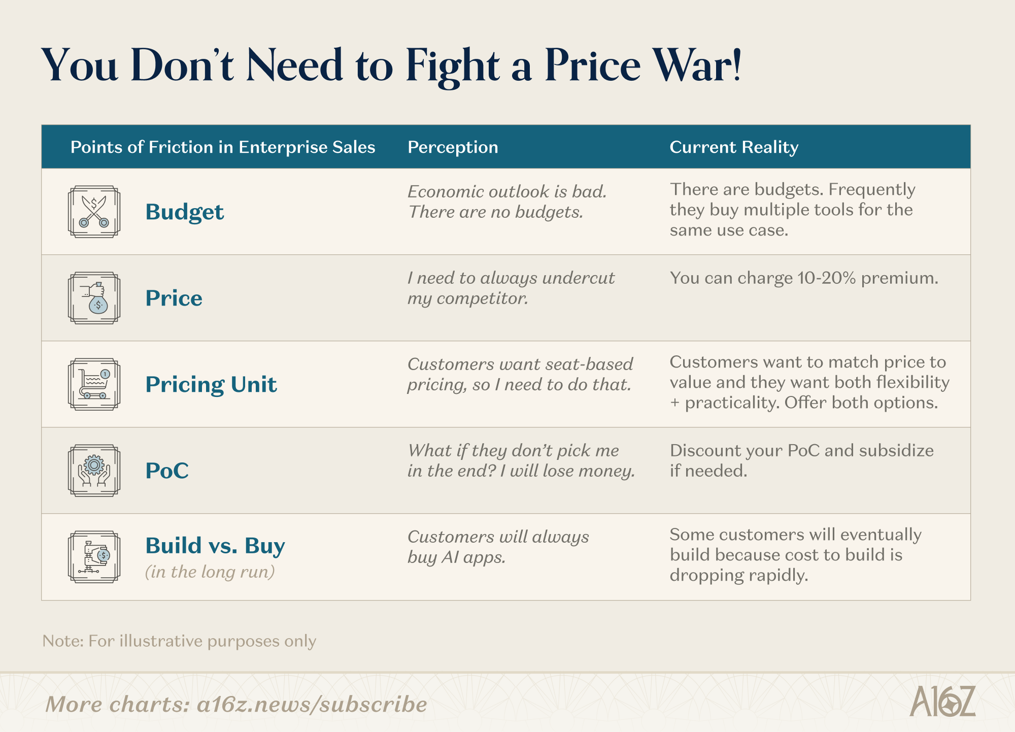 There is no silver bullet for pricing wars; there never has been. But, for AI application companies anyway (this piece isn’t for model providers; that’s a whole different story), if these enterprise buyers are any indicator, you don’t have to give it all away. Here’s what we learned: