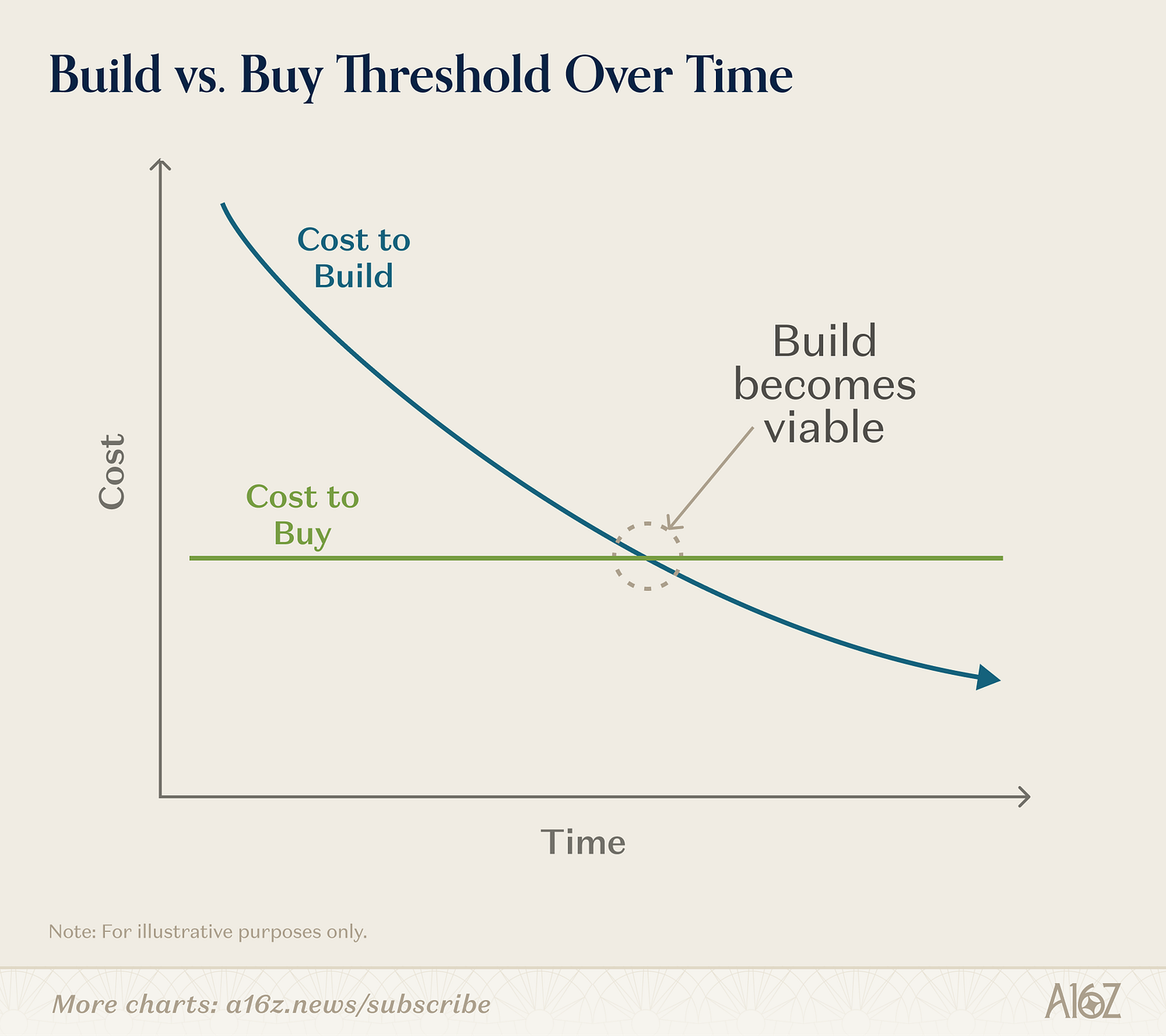 When models are expensive and complex to deploy, the case for buying a purpose-built AI app is straightforward. But as inference costs drop and model APIs become easier to integrate, the internal cost of building a custom solution approaches — and in some cases falls below — the cost of a third-party subscription.