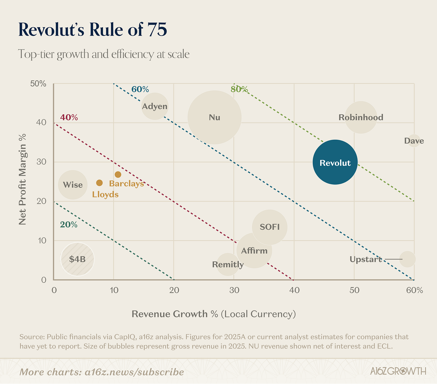 Revolut continues to grow quickly and efficiently—its rule of 75% (defined as revenue growth + net profit margin) is in the highest tier among modern and established financial institutions.