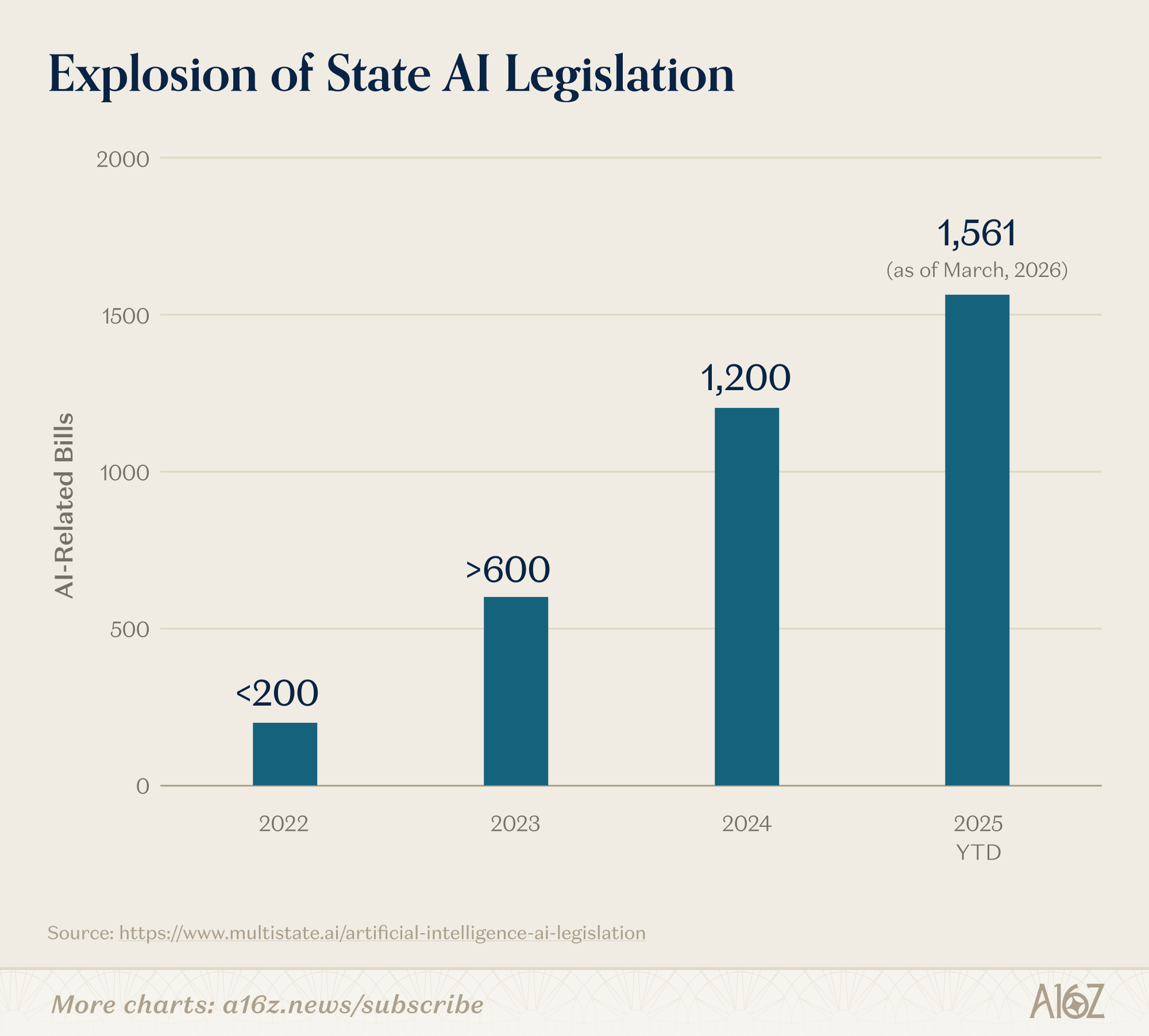 These limits are increasingly significant in AI governance, where states are legislating at an extraordinary pace. In 2025, more than 1,000 state-level AI bills were introduced across all 50 states. In 2026, the pace has accelerated: as of March, lawmakers in 45 states had already introduced over 1,500 AI-related bills, surpassing the total for all of 2025. With states driving AI governance in the U.S., the constitutional limits on their authority will shape the regulatory landscape.
