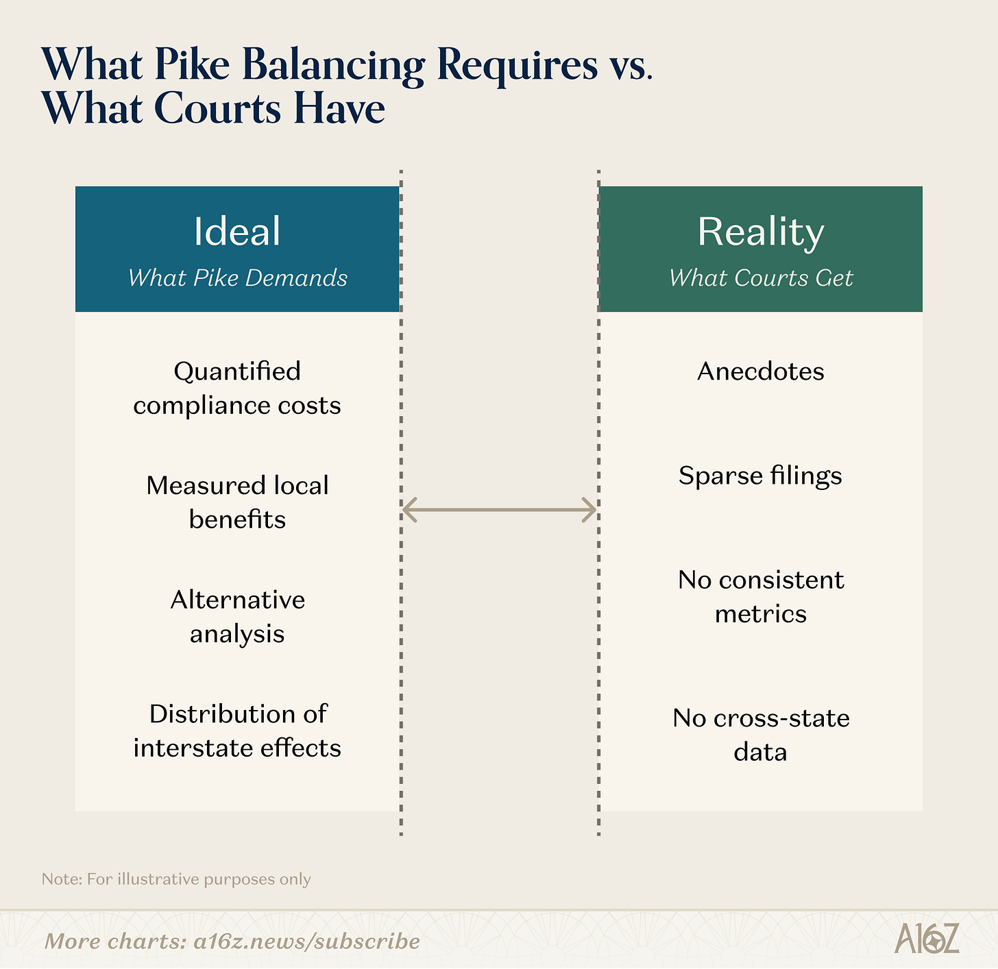 The doctrine demands cost-benefit analysis; the record rarely supplies it. And if judges are ill-equipped to determine whether state AI laws violate the dormant Commerce Clause, judicial review will be less accurate: unconstitutional laws with high compliance costs may survive, making it harder for Little Tech to compete, while laws that serve legitimate state interests and impose minimal costs on startups and other firms may be struck down for lack of an evidentiary record to support them.