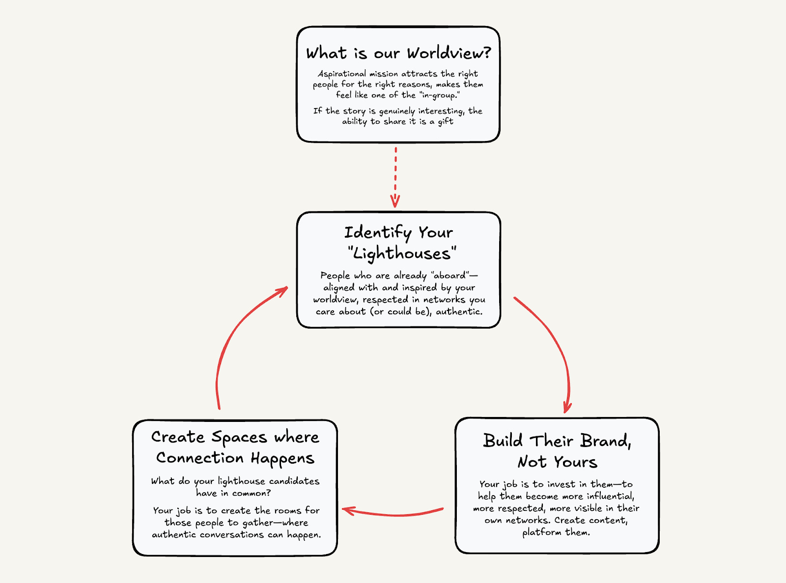 You can get started on this early. Think about what your lighthouse candidates have in common. Let’s say your customers are marketing leaders in Europe. Maybe it’s that they’re all struggling with similar operational challenges but have never had a room to realize that. Your job is to create the rooms for those people to gather—where authentic conversations can happen. Regular dinners, small forums, intimate gatherings organized around genuine shared interests.
