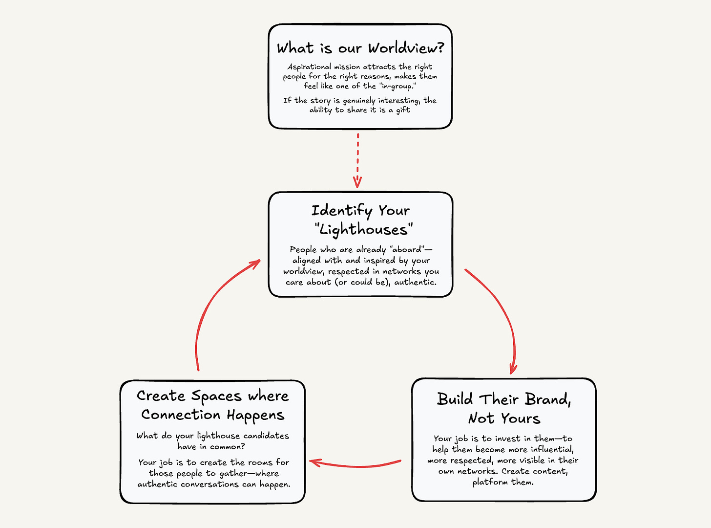 This matters because the narrative is what allows your lighthouses to shine your signal without it feeling like marketing. If the story is genuinely interesting, sharing it is a gift. If it’s just product positioning, sharing it is a favor—and favors don’t compound.