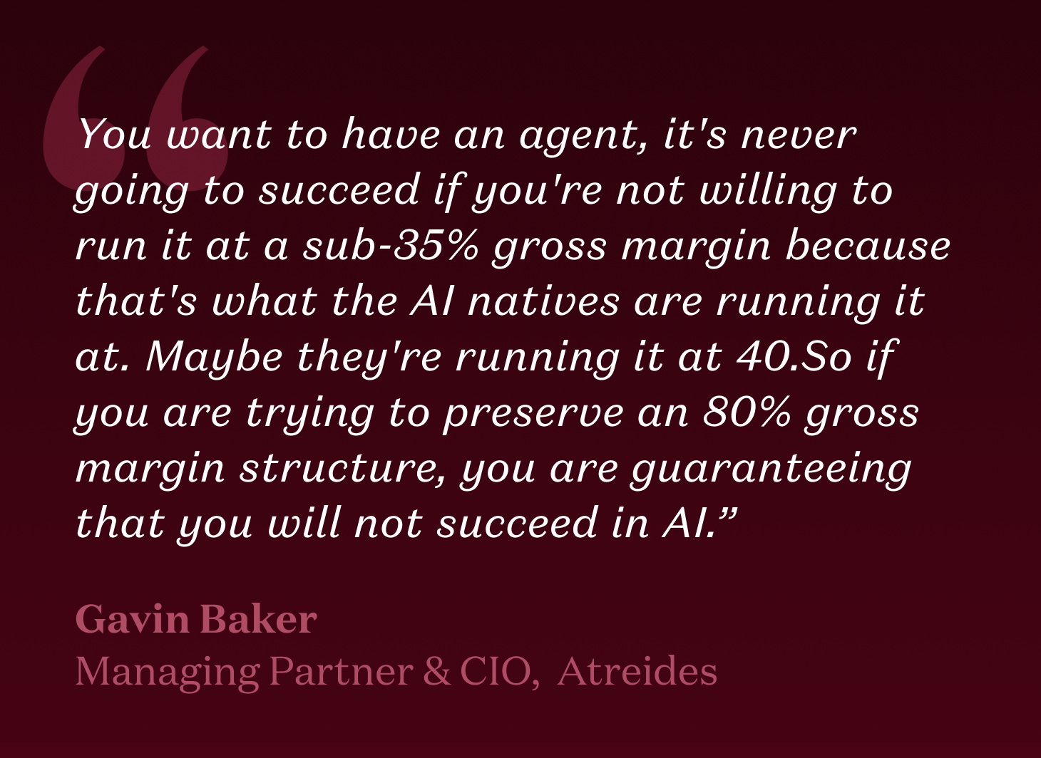 If putting engineers on planes is what it takes to land a $1M+ deal with a Fortune 500 or government agency, many early-stage companies will gladly trade gross margin for momentum. Investors are also increasingly comfortable with suboptimal gross margins given novel AI experiences with lots of inference often require them. The bet is that you’ll earn the position and the trust with client leadership to deliver outcomes, and price accordingly.