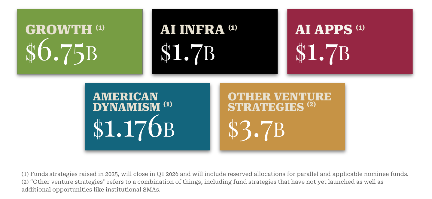 In a year in which venture fundraising was dominated by a small number of large firms, a16z raised more than the next two funds - Lightspeed ($9B) and Founders Fund ($5.6B2) - raised in 2025, combined.