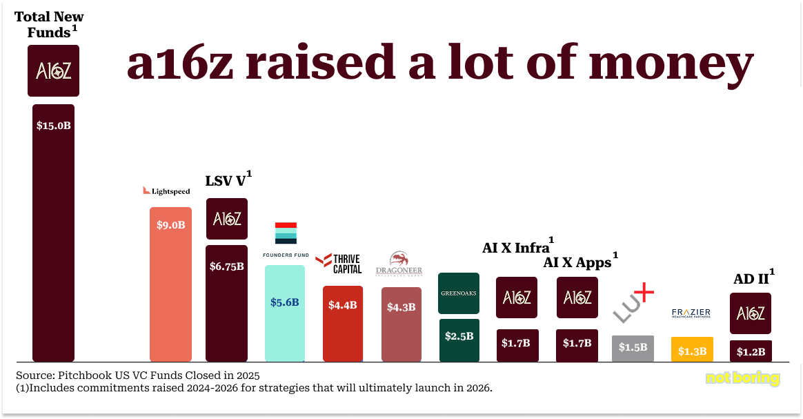 In the worst VC fundraising market in five years, a16z accounted for over 18% of all US VC funds raised in 20253. In a year in which it took the average VC fund 16 months to close their fund, a16z took just over three months from start to finish.