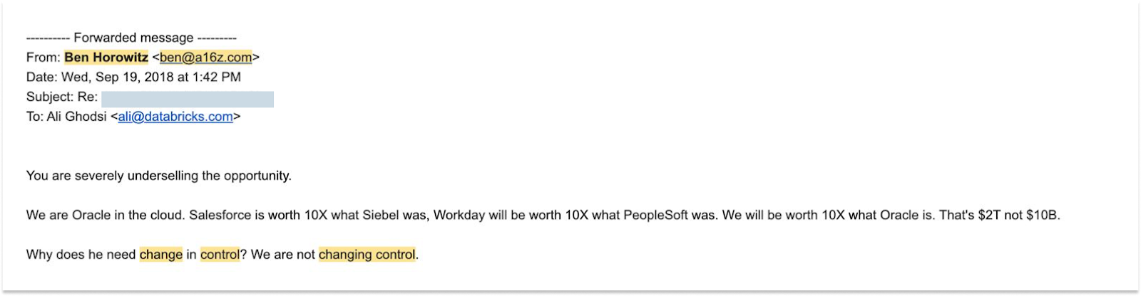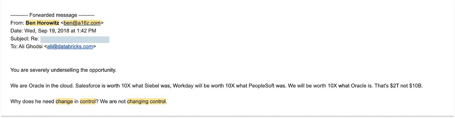 It was a sticking point, so Ali asked Ben to help convince the guy that the value of Databricks was “at least $10B.” Ben talked to him, and then sent Ali this email: