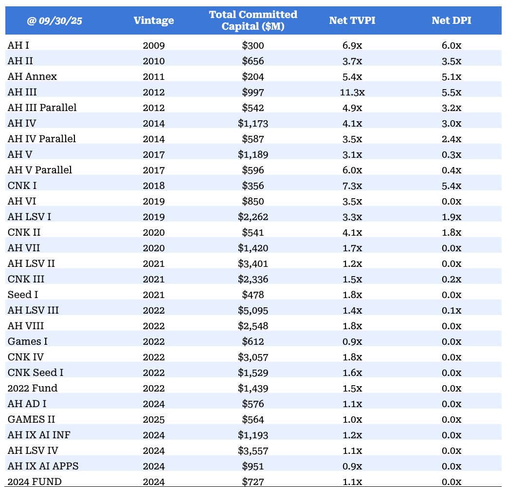 All figures as of 09/30/25 unless otherwise noted. All performance figures, valuations and fund summaries contained herein are unaudited and subject to change. Past performance is not indicative of future results. There can be no assurances that any future a16z Capital Management, LLC fund or investment will achieve comparable results. Furthermore, performance of any future ACM fund will not be comparable to performance of existing funds due to material differences in market conditions, differences in investment strategy and other factors. No individual investor or fund received investment performance illustrated above.