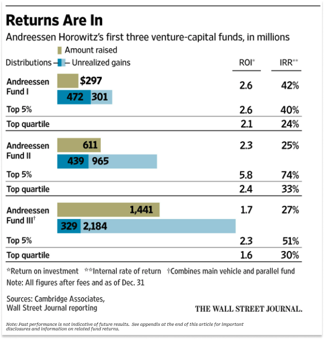 In 2016, The Wall Street Journal published an article that Acquired’s David Rosenthal called “so clearly a hit piece planted by rival venture firms” titled Andreessen Horowitz’s Returns Trail Venture-Capital Elite, when its funds were seven, six, and four years old, respectively. It showed that while AH Fund I was a top 5% VC fund, AH II was merely top quartile, and AH III was actually slightly outside of the top quartile.