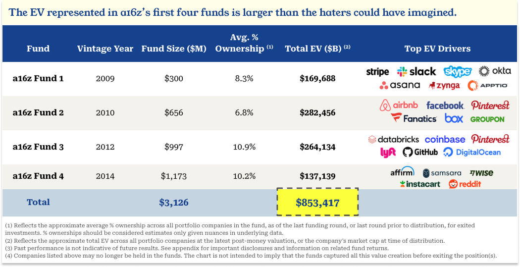 Below is the aggregate portfolio value of those first four funds, the ones that would have had to be worth $240-480 billion to clear that rival VC’s hurdle. Combined, a16z Funds 1-4 had a total enterprise value of $853 billion at distribution or latest post-money valuation7.