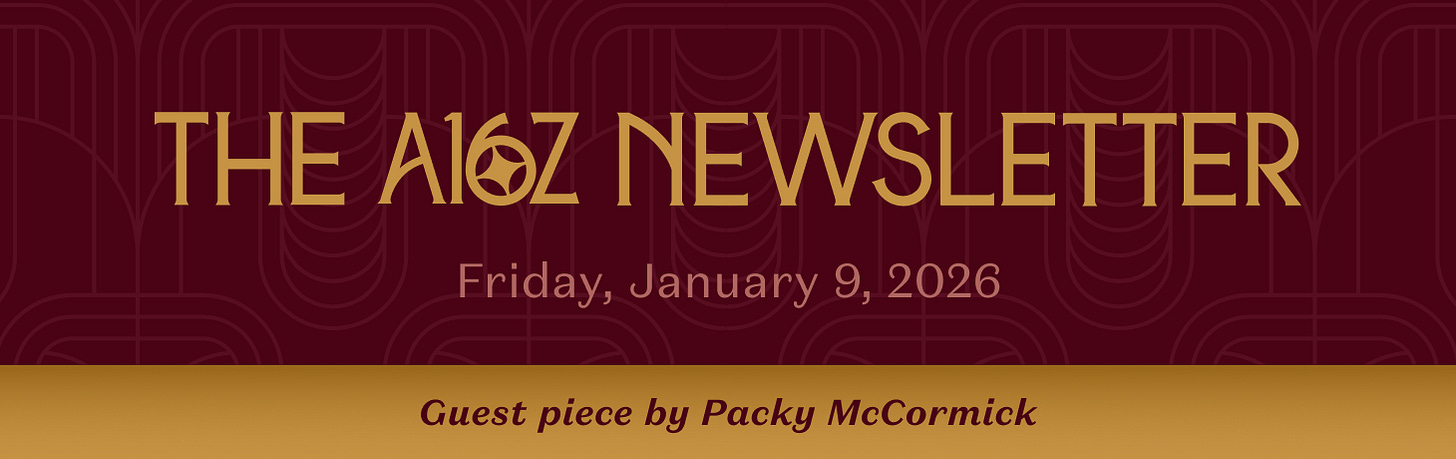 This newsletter is provided for informational purposes only, and should not be relied upon as legal, business, investment, or tax advice. Furthermore, this content is not investment advice, nor is it intended for use by any investors or prospective investors in any a16z funds. This newsletter may link to other websites or contain other information obtained from third-party sources - a16z has not independently verified nor makes any representations about the current or enduring accuracy of such information. If this content includes third-party advertisements, a16z has not reviewed such advertisements and does not endorse any advertising content or related companies contained therein. Any investments or portfolio companies mentioned, referred to, or described are not representative of all investments in vehicles managed by a16z; visit https://a16z.com/investment-list/ for a full list of investments. Other important information can be found at a16z.com/disclosures. You’re receiving this newsletter since you opted in earlier; if you would like to opt out of future newsletters you may unsubscribe immediately.