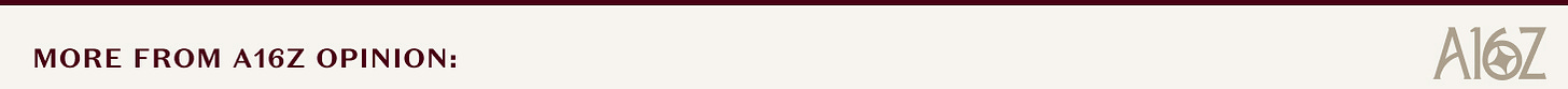 This newsletter is provided for informational purposes only, and should not be relied upon as legal, business, investment, or tax advice. Furthermore, this content is not investment advice, nor is it intended for use by any investors or prospective investors in any a16z funds. This newsletter may link to other websites or contain other information obtained from third-party sources - a16z has not independently verified nor makes any representations about the current or enduring accuracy of such information. If this content includes third-party advertisements, a16z has not reviewed such advertisements and does not endorse any advertising content or related companies contained therein. Any investments or portfolio companies mentioned, referred to, or described are not representative of all investments in vehicles managed by a16z; visit https://a16z.com/investment-list/ for a full list of investments. Other important information can be found at a16z.com/disclosures. You’re receiving this newsletter since you opted in earlier; if you would like to opt out of future newsletters you may unsubscribe immediately.