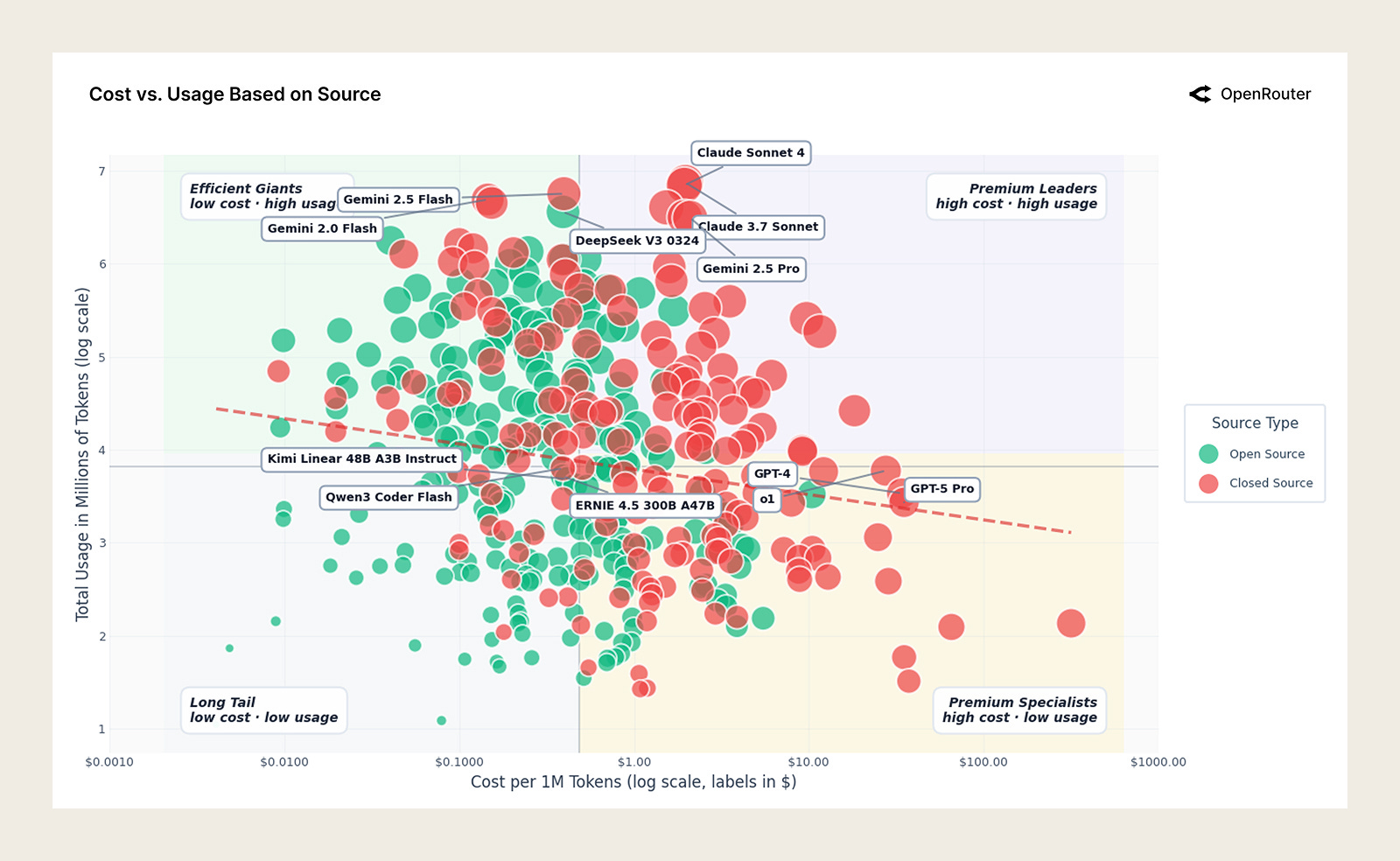 The State of AI: An Empirical 100 Trillion Token Study with OpenRouter provides a deeper analysis of these trends, including open vs closed source model usages, geographic patterns, category taxonomies, and cohort-based insights into long-term engagement.