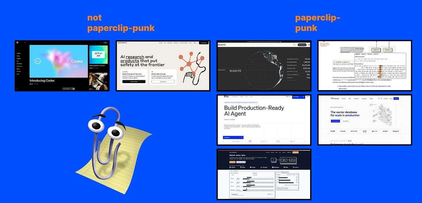 Some categorization: the OpenAI website is not paperclip-punk. The World website is. Anthropic’s main website is not, but their interpretability research is. Figma is not paperclip-punk (nor is its output). Excalidraw is (as is its output). p5.js: no. d3.js: yes. Linear’s logo is not (usually), but somehow their favicon is. Pinecone is paperclip-punk-lite. Retool and Supabase are, to my knowledge, the only two companies that have pulled off the near impossible: paperclip-punk in darkmode. Open source projects like PostHog and Dify, and turbopuffer’s website are all textbook paperclip-punk. Clippy, the beloved Microsoft Word paperclip is alas, not paperclip-punk. paperclip-punk repels anthropomorphization.