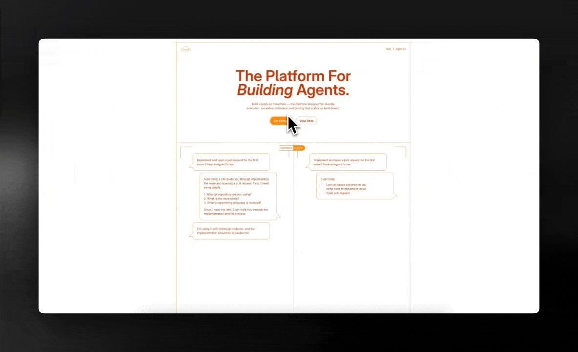 Further on in the site, there are other fantastic details. An on-hover module that illustrates the various component products of the Agent stack: Voice, Chat, and Email (all ingestion methods for prompts), self-hosted models or LLM-calling via the AI Gateway, workflows, MCP servers, and more. It all looks so simple. Lower down, there’s a comparison of static hyperscaler pricing for inference (indicated by a straight price ceiling) and Cloudflare’s dynamic pricing (a swooping sparkline reflecting peaks and troughs in inference usage). “Scale Up Or Down” (automatically). There’s something to be said about the speed with which you’re guided through the site: you can almost scroll through without reading anything, and still come away with the site’s takeaways. I think this speed is a key distinguisher of any true paperclip-punk design.