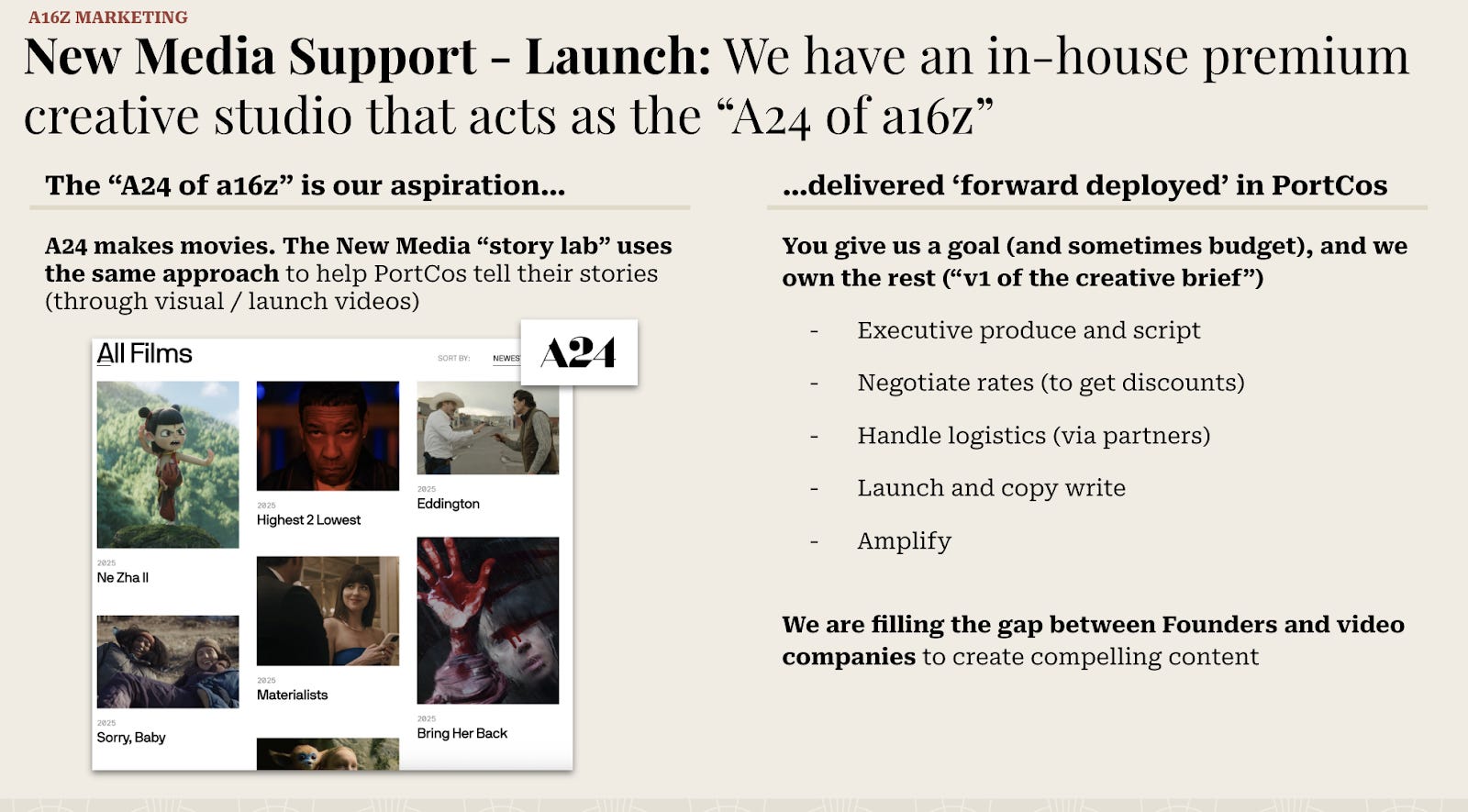 One of the most important things you can do with that asset to help founders and to help a16z is to reach the next cohort of great founders and key hires. Help the best people preferentially attach to our portfolio companies – and to a16z itself. Seeding that relationship, and building that trust, takes a long time. So we’re building an ecosystem team within New Media who is seeding the group chats, the dinners, the events, and the hidden networks that help talented and trusted people find each other and vouch for each other. And when the time comes, help each other find their next great challenge. You’ll be hearing more about this soon.