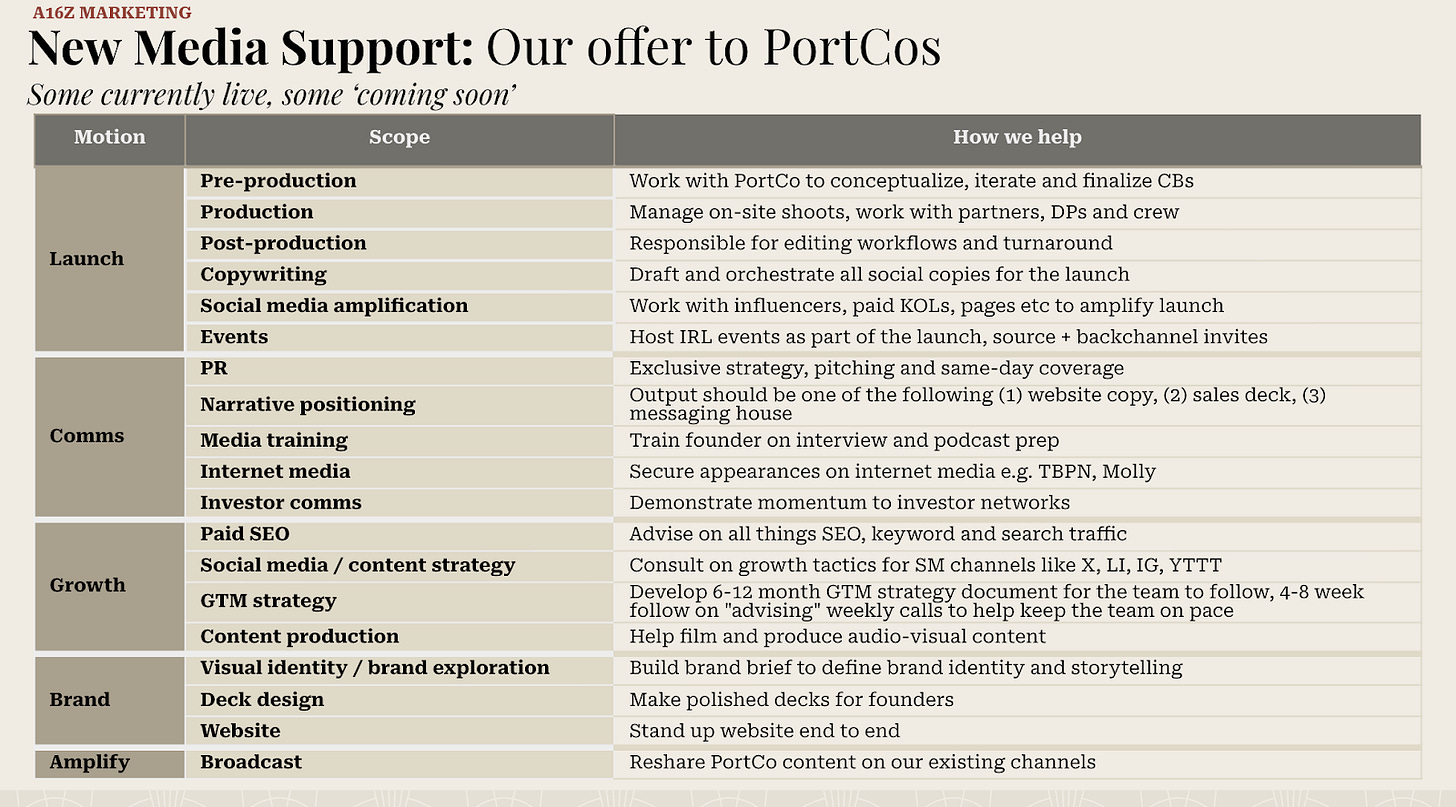 If the goal of a VC firm is to get you power and legitimacy, then what does the New Media team do? Well, it should be able to help you dominate the timeline, on demand. This is an obvious goal to offer, but a very hard thing to actually be able to execute.