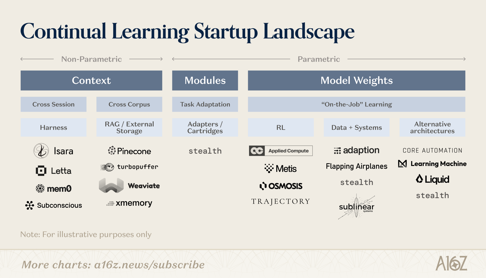 The non-parametric end of the spectrum is the most familiar. Harness companies (Letta, mem0, Subconscious) build orchestration layers and scaffolding that manage what goes into the context window. External storages and RAG infrastructure (e.g. Pinecone, xmemory) provide the retrieval backbone. The data exists, the challenge is getting the right slice of it in front of the model at the right time. As context windows expand, the design space for these companies grows with them, particularly on the harness side, where a new wave of startups is emerging to manage increasingly complex context strategies.